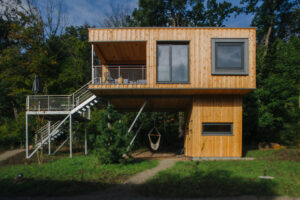Baumwipfelhaus in moderner kubischer Form mit großzügigen Fenstern